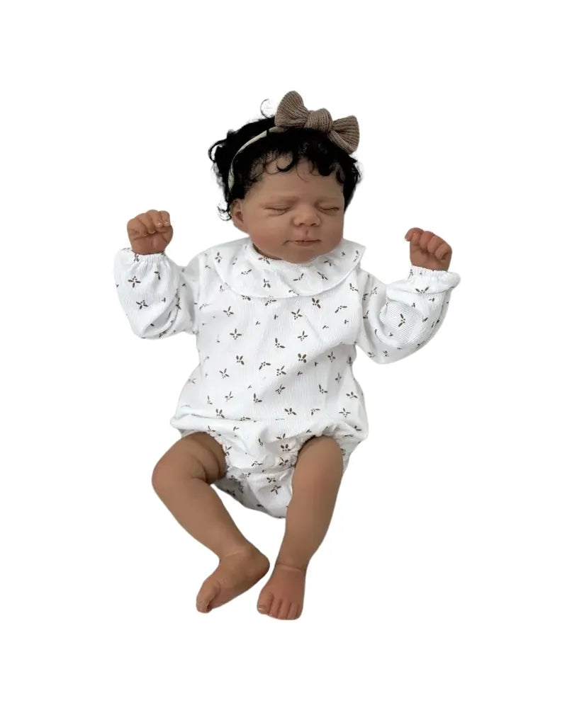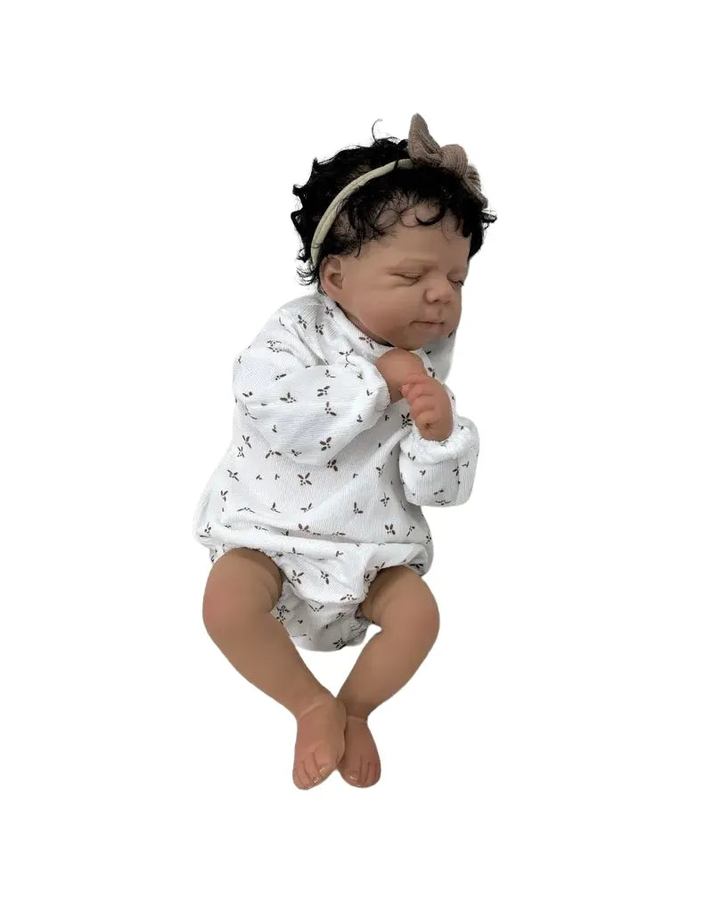 Baby Cuddles is an impressively realistic doll, designed to recreate the softness of a peacefully sleeping newborn. With her curly hair, matching headband, and printed cotton outfit, she brings a real sense of tenderness to everyday play. Perfect for children who love to imitate, care for, and create lovely, affectionate stories.